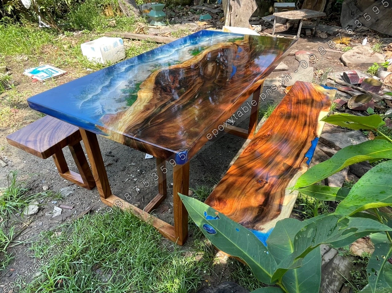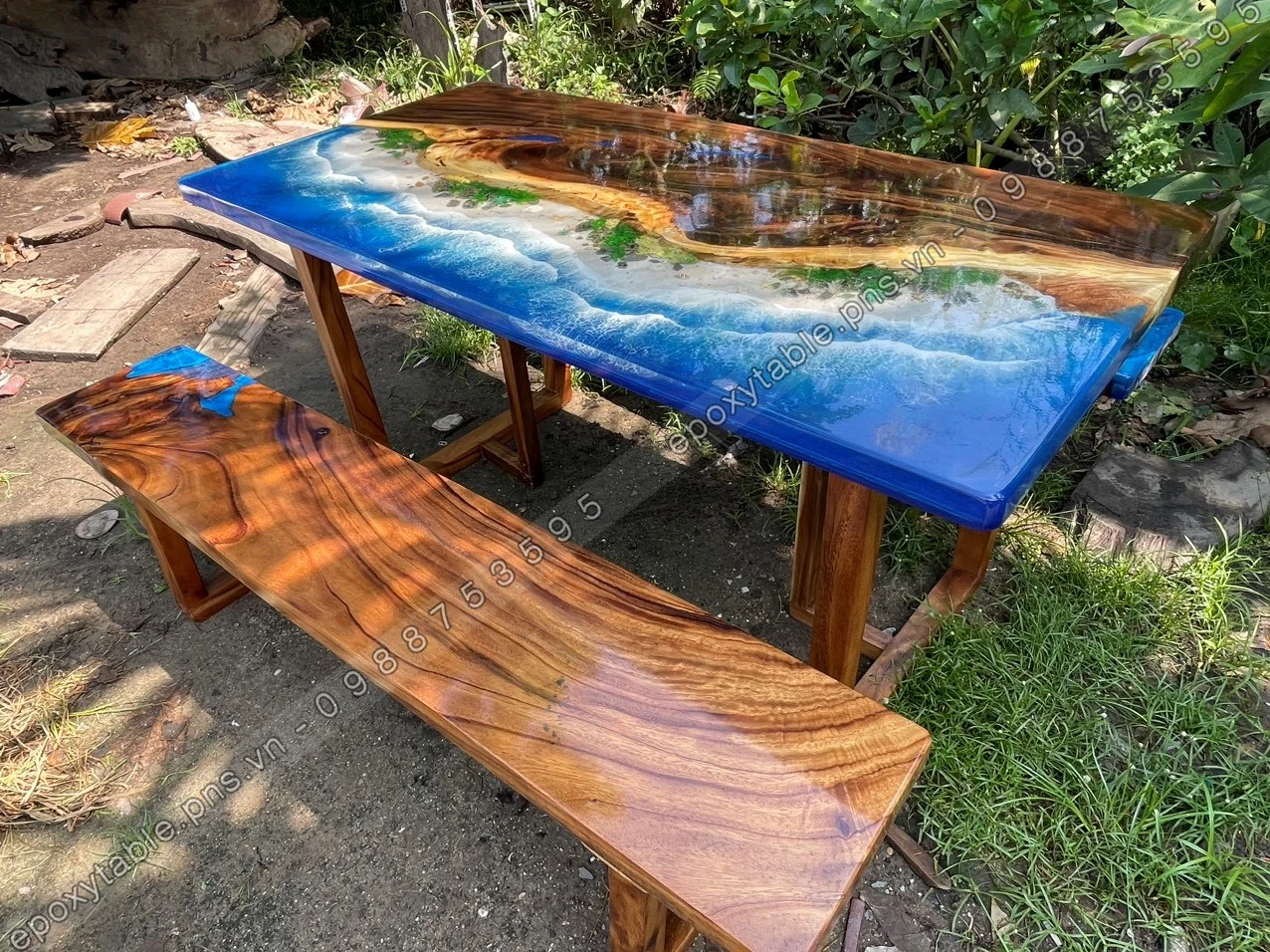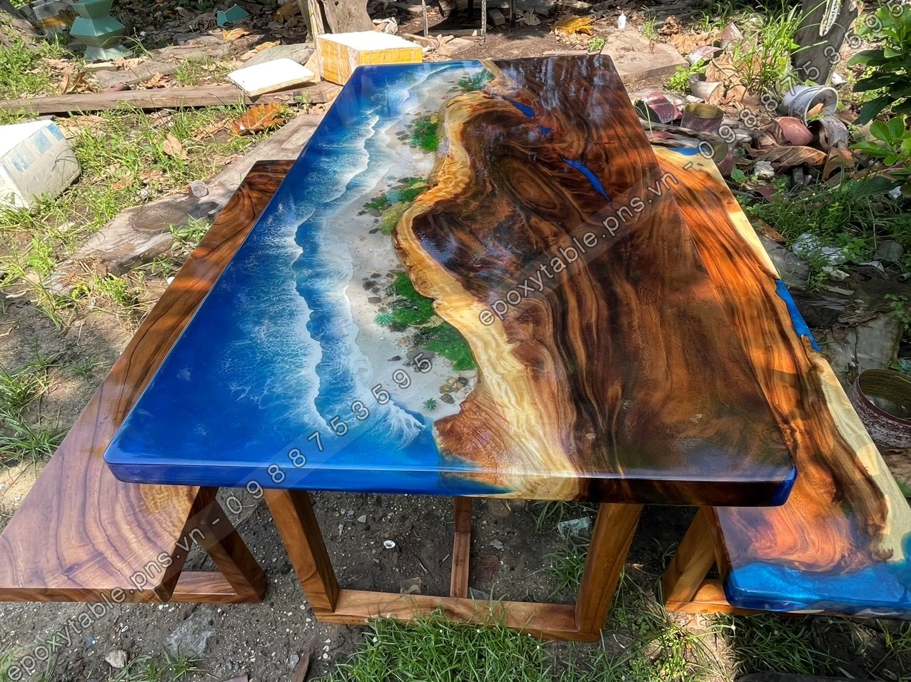 Chiếc bàn được lấy cảm hứng từ hình ảnh bãi biển xanh ngọc cùng những con sóng trắng xô bờ, tái hiện sống động ngay trên mặt bàn. Phần gỗ tự nhiên giữ nguyên vân gỗ độc đáo, kết hợp cùng lớp epoxy trong suốt tạo nên hiệu ứng biển sâu chân thực, như một góc đại dương thu nhỏ trong ngôi nhà.
