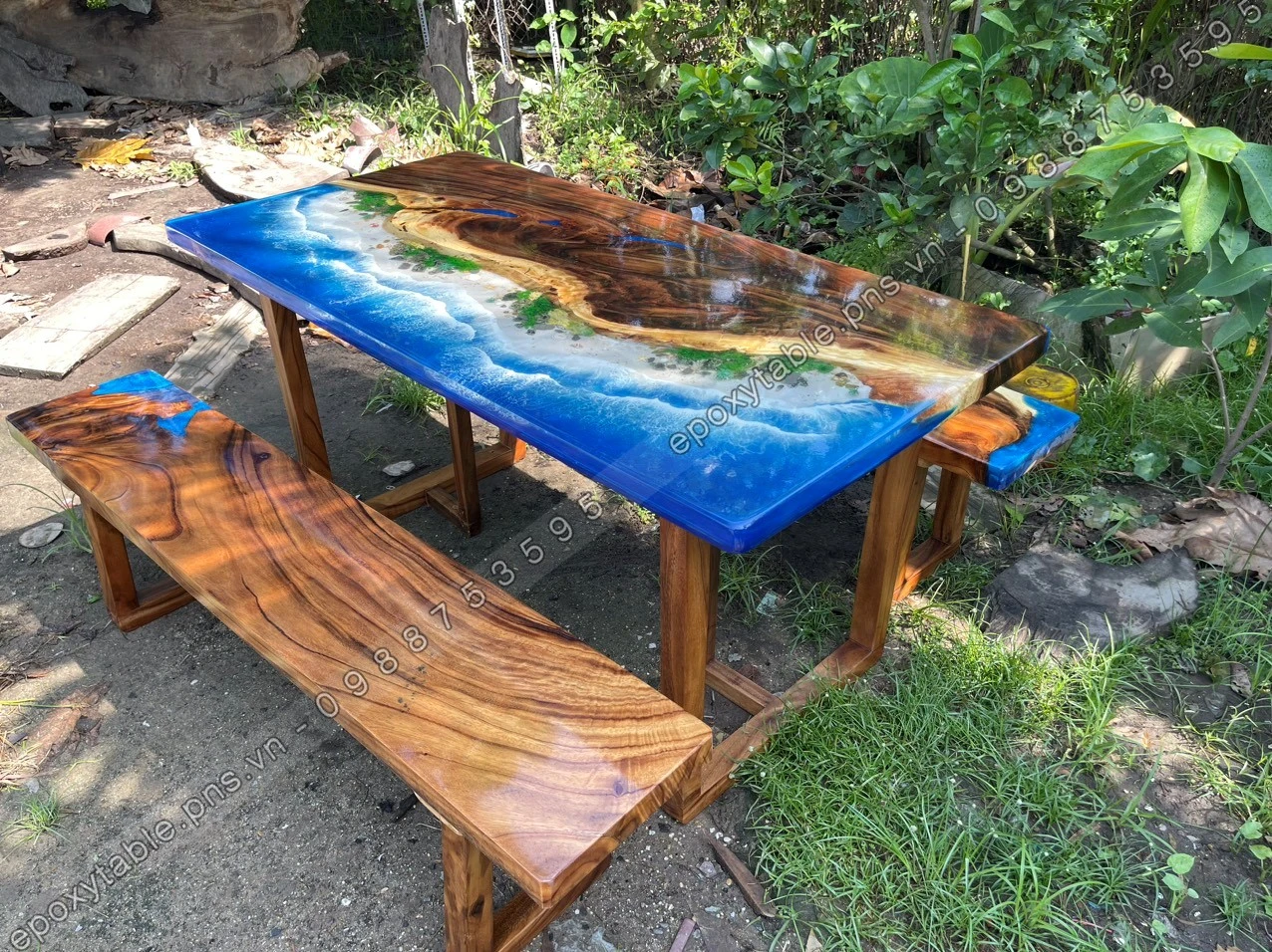 Kỹ thuật đổ epoxy nhiều lớp giúp từng gợn sóng hiện lên mềm mại, sắc xanh chuyển màu hài hòa từ đậm đến nhạt, mang lại cảm giác thư thái và mát lành. Những chi tiết nhỏ như bãi cát vàng, đá sỏi, rong rêu được xử lý tinh tế, khiến chiếc bàn không chỉ là nội thất mà còn là một bức tranh nghệ thuật sống động.