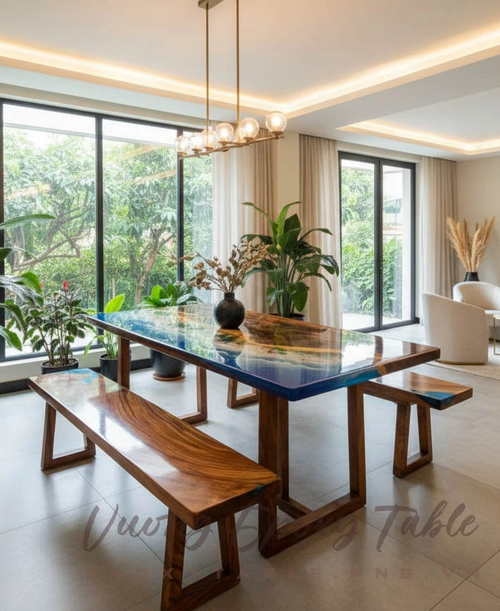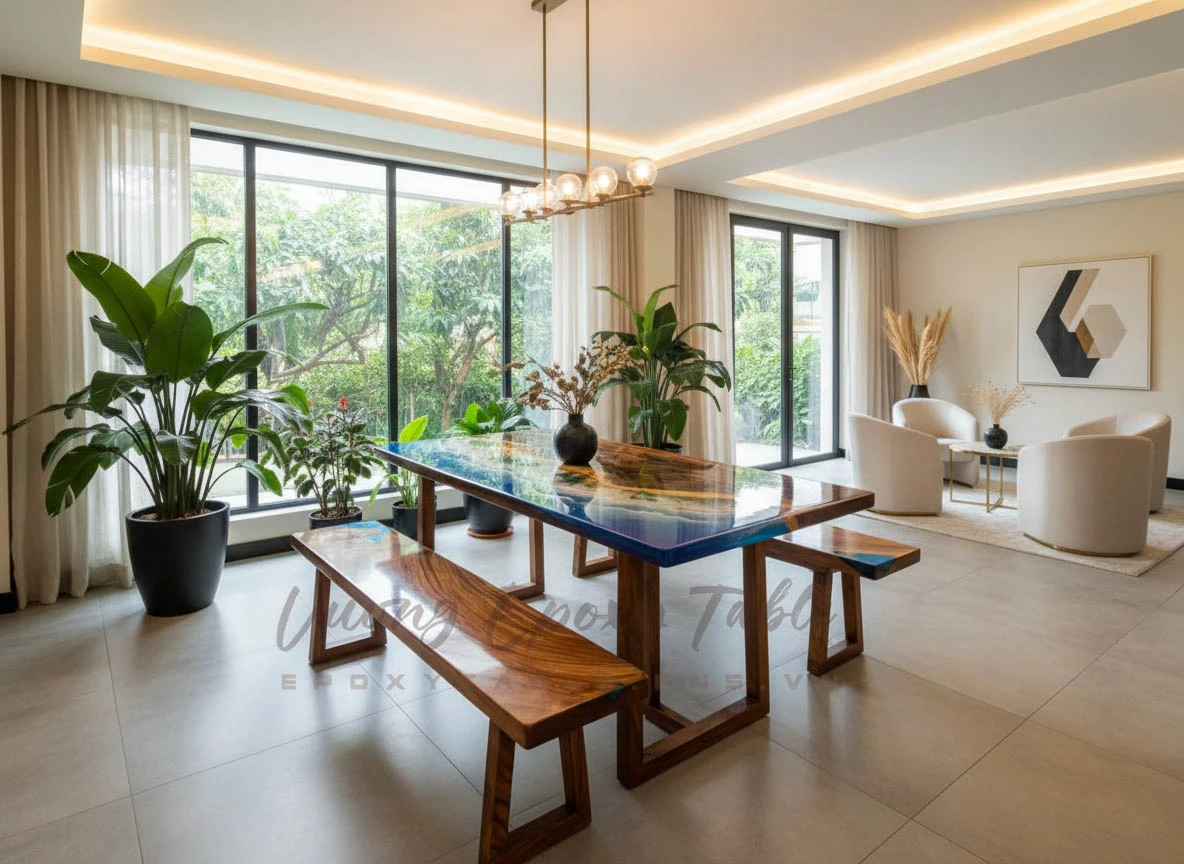 Bàn ăn được chế tác từ gỗ me tây nguyên khối, loại gỗ nổi tiếng với vân gỗ mềm mại, màu sắc ấm áp và độ bền cao. Bề mặt được phủ keo epoxy trong suốt giúp giữ nguyên vẻ đẹp tự nhiên của gỗ, đồng thời chống thấm nước, chống trầy xước và tạo hiệu ứng chiều sâu sang trọng. Sự kết hợp này mang đến một chiếc bàn vừa bền chắc, vừa mang giá trị thẩm mỹ độc đáo.